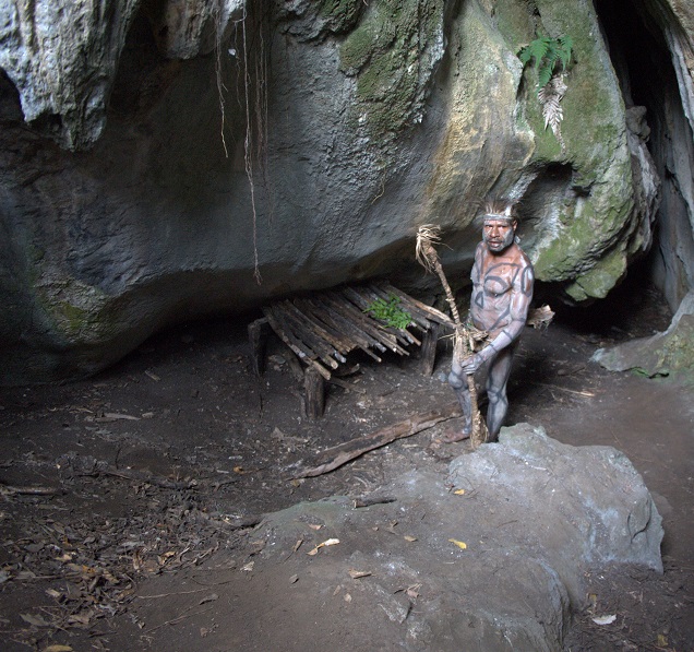 下の写真は、アイヴァンさんの案内でゴロカから車で数十分走った村で我々を迎えてくれたサイモンさん。ツーリストが来るたびサイモンさんは、この格好になる。ディズニーランドのアトラクションみたいなものだ。 この洞窟は、入口がわかりづらい場所にありる。また、先祖代々の神聖な隠れ家で、村にやってくる敵をここで隠れて待ち伏せし、相手を不意打ちする。数十年前まで、実際に相手と殺しあったようだ。人肉を食ったこともあるかも知れない。山の山頂では、誇らしげに自分の土地の境界を説明してくれた。