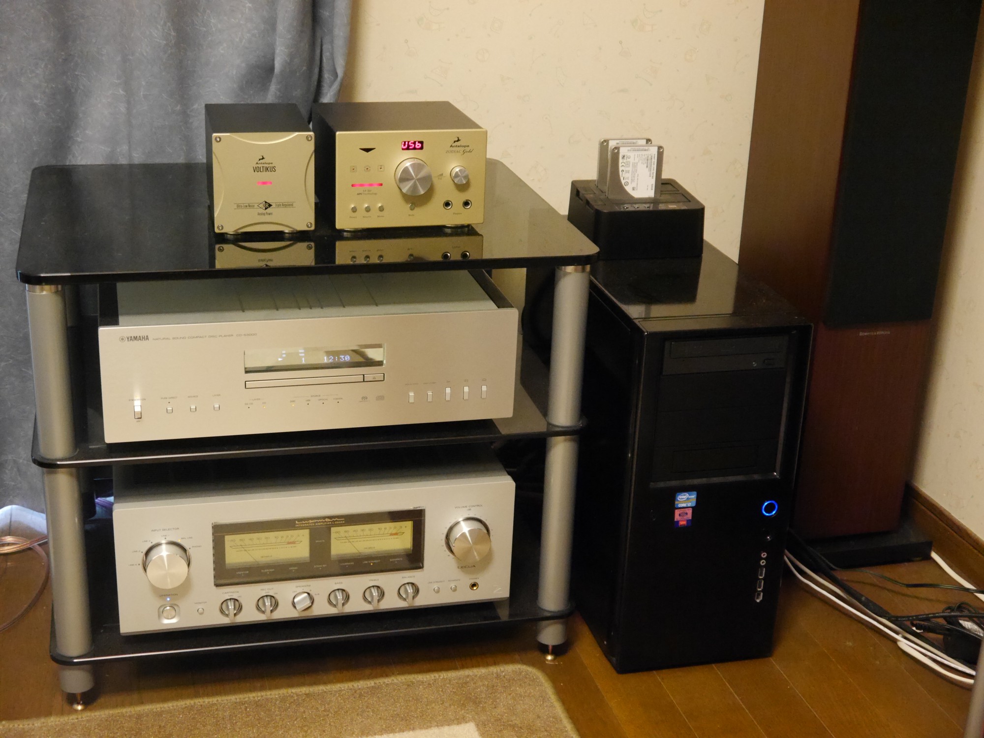 こちらが、部屋の装置の写真である。ラックの上段が、YAMAHA CD-S3000である。下段が、プリメインアンプのLUXMAN L-550AX。この二つは日本製だ。上面に乗っているのがDACのZODIAC GOLDと電源部のVOLTIKUSである。ホームページをみたらブルガリア製だった。右の黒い箱ははタワー型のファンレス自作パソコンである。上に載っているのは、SSDが刺さったストレージのアダプターだ。さらに右の背の高いのが、スピーカーB&WのCM8。こちらはイギリス製だ。