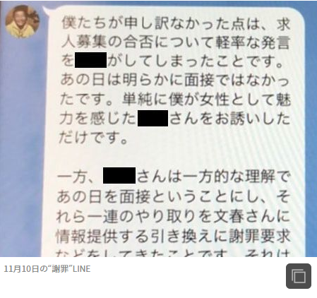 180度話が変わってしまう!が、女優の剛力彩芽さんは、前ZOZOTOWNの社長前澤友作さんとごく最近別れたのだが、その破局の原因と思われる、前澤さんが秘書の採用面接にやってきた女性を口説こうとした様子が週刊「文春」に載っていた。こういう生々しい文章が暴露されることは昔ならなかなかなかったはずだが、現代はこういうことが簡単に起こるのですね。
