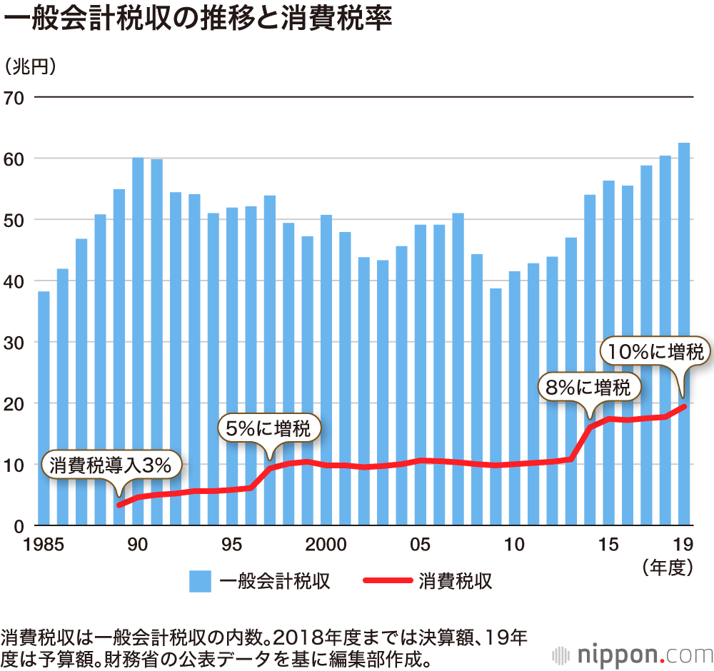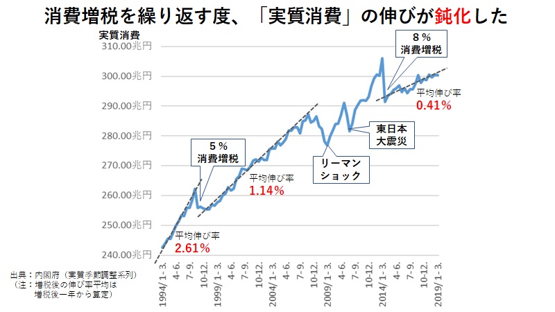 今回の新型コロナによる不況の対応として、消費税の0%化を強く主張されている、京都大学の藤井聡教授がテレビで興味深いボードを紹介されていた。下のチャートがそうなのだが、消費税率を上げるたびに、消費の伸びが鈍化するというものだ。