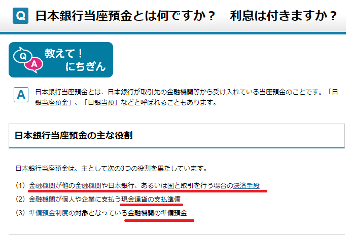 次の《日本銀行当座預金とは何ですか?》は、日銀のHPに書かれた日銀当座預金の説明である。その説明では次のようになっている。
