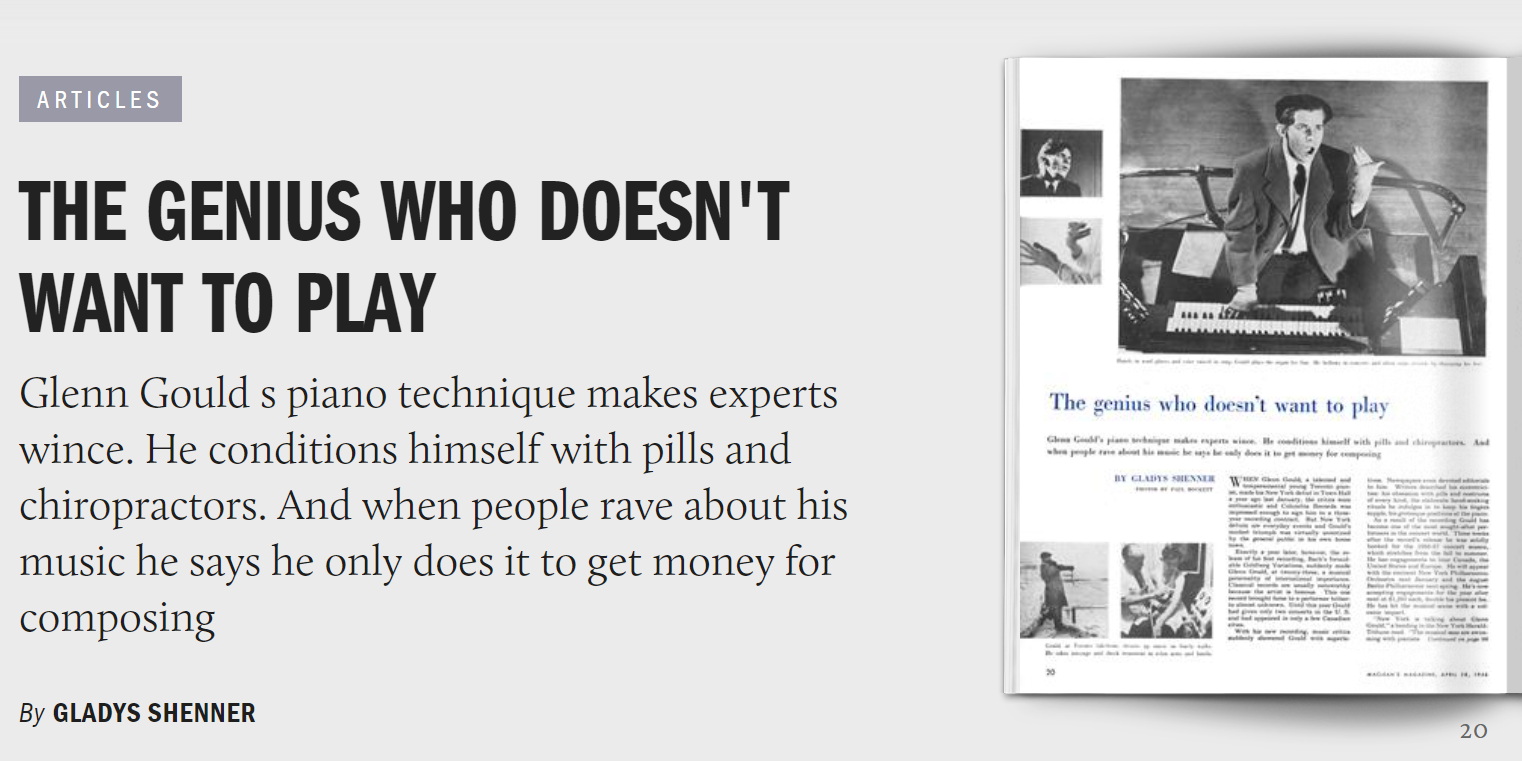 そうして、インパクトのある風変わりなピアニストの写真数枚とともに、大作である記事が出来上がった。もとの記事から、グールドの女性関係をバッサリ削っても10ページ以上ある長文だった。それが、《[4]演奏したくない天才》だった。