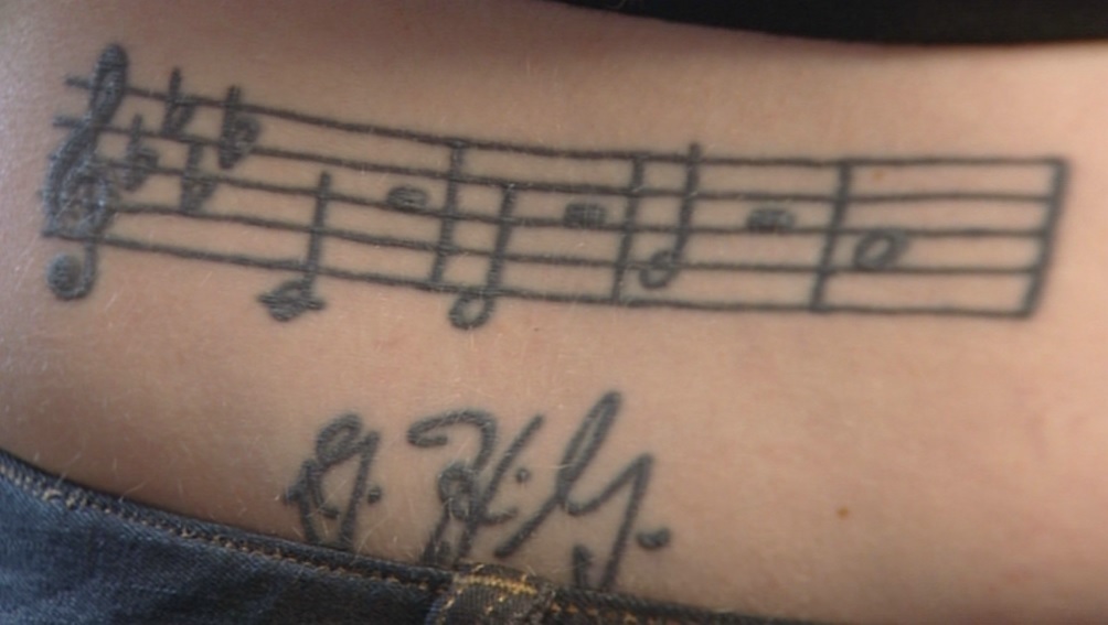 「この四重奏曲は私の中に大きな跡を残しました。トロントまでグレン・グールドが生きた場所の巡礼に行ったとき、偶然街角の店の前で小さなプレートを見かけたのです。その時私は、『この4つの音はすごい力を持っている!』と思いました。このモチーフは伝記に載っていたものです。私はレコード屋で働いていたボブという男性にこのモチーフをコピーしてほしい、と頼みました。彼ははじめTシャツ用だと思ったみたいです。翌日Tシャツをめくって「さあ、始めて!」と私が言ったら、ボブははじめショックを受けていましたが、その後は、彼の悪魔的な部分が目覚めたのか、なかなかクールじゃないか、と思ったみたいです。ふつう入れ墨されるのは、ヘビーメタルのグループ名ですが、これはクラシック音楽の演奏家のためでしたから。」