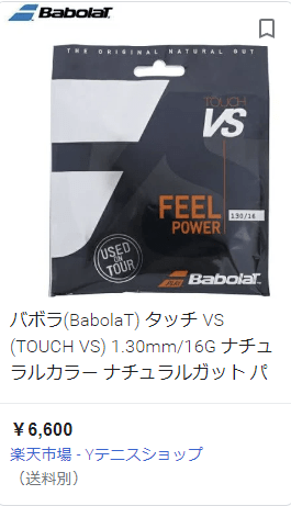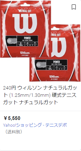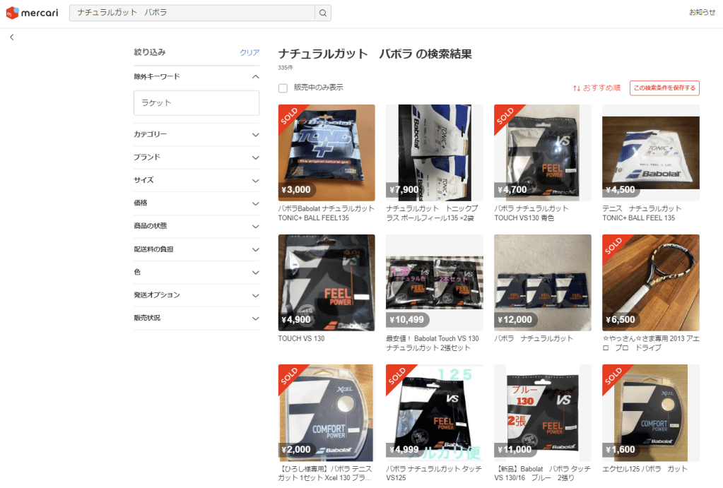 あと、ガットを安く買う方法としては、メルカリもあるだろう。下が、実際にメルカリで「ナチュラルガット バボラ」というワードを使って検索したものだ。メルカリで、辛抱強くウォッチしていると、非常に相場より安い値段で売られることがままある。