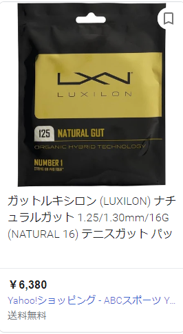 あと、ガットを安く買う方法としては、メルカリもあるだろう。下が、実際にメルカリで「ナチュラルガット バボラ」というワードを使って検索したものだ。メルカリで、辛抱強くウォッチしていると、非常に相場より安い値段で売られることがままある。