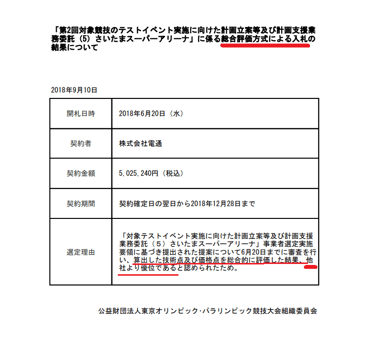 例えば、2018年6月に入札が行われた「テストイベント実施に向けた計画立案及び計画支援業務(5) さいたまスーパーアリーナ」という電通が落札した案件は、次のような形式で公開されている。(この形式で公表しているのは、競争契約に限られる。)