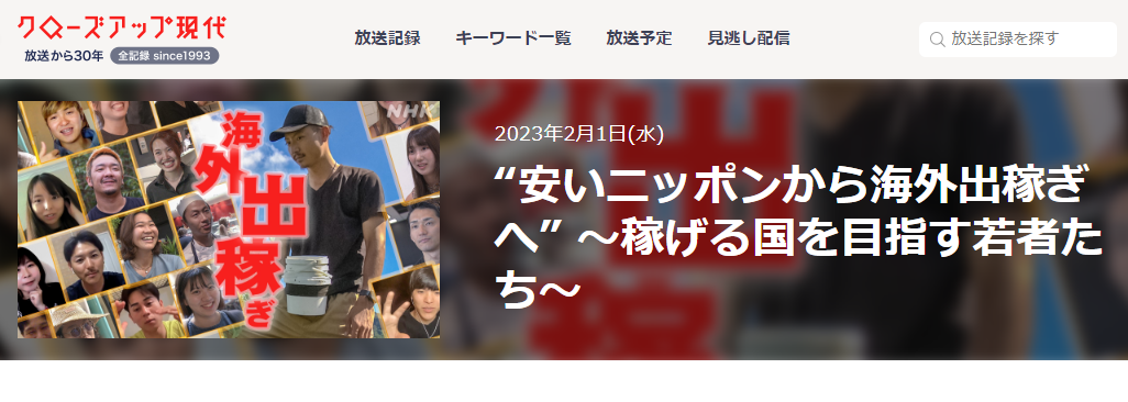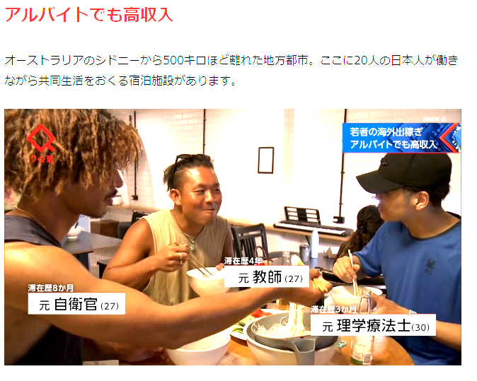 ● 海外へ行けば、職業によるだろうが、大変な介護や肉体労働などでは月に100万円近く稼げる。下のリンクは、NHKのクローズアップ現代という番組が、日本を脱出した若者が、海外で日本の数倍の給料を手にするだけでなく、《希望》も見つけたという内容だ。