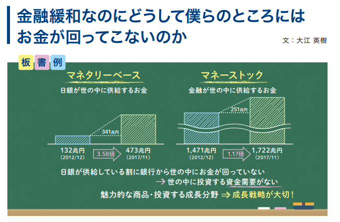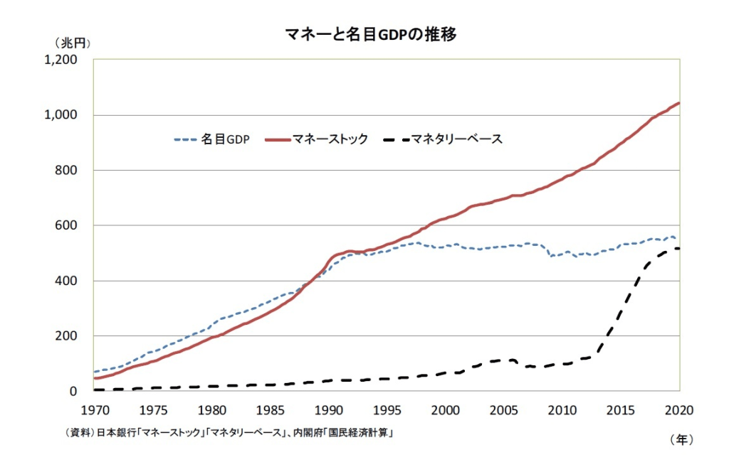 マネタリーベースの増加は、市中の通貨流通量を増やさないものの、市中銀行のバランスシート(貸借対照表)を大きくする効果があり、マーケットのマインド(期待)を変え、市中銀行から民間企業への貸し付けの増加(=マネーストックの増加)を狙ったものだった。しかし、デフレマインドが解消されない、少子化が進む、技術革新がなかなか日本でないことなどなどで、民間企業は銀行から借り入れを増やさなかった。
