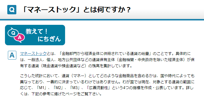マネーストックは、金融機関(市中銀行)が世の中に供給したお金のことで、具体的には、企業や家計、地方公共団体などの経済主体が保有する現金や預金の残高のことを言う。(ここには、日銀と市中銀行が持つマネタリーベースは含まれていないので注意。)