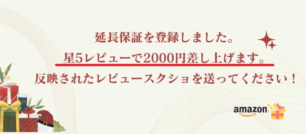 これはヒドイよね。2000円をもらえるからといって、みんなが星5のレビューをすれば、口コミが歪んで行き、信頼できなくなる。どこの会社の製品か調べてみたら、どうやらやはり中国製らしい。
