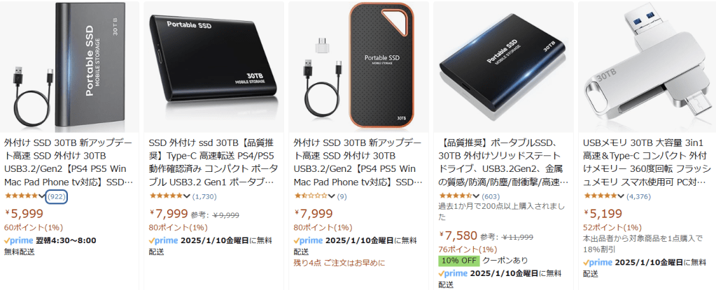 アマゾンは他にもいい加減な売り方をしている。メルカリなどでも同じような商品を見たことがある。パソコンなどの記録媒体にSSDというものがあるのだが、それが怪しい。下の写真の商品は、正規のメーカー品と比べると数十倍安い。また、メーカー品で、30TBの容量のものが売られているのを親爺は見たことがない。