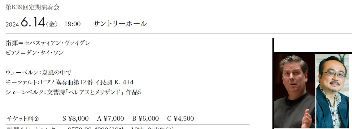 6/14のウェーベルン「夏風の中で」、シェーンベルク「交響詩ペレアスとメリザンド」は、今となっては印象がなにも残っていない。ダン・タイ・ソンがピアノを弾いたモーツアルト「ピアノ協奏曲12番」で観客は大喝さいしていたが、親爺には、ダン・タイ・ソンってこんなものなの?という感じで、拍子抜けである。