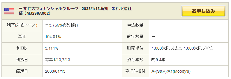 まず、利率。 これは最初の欄に書かれたとおりで、上の三井住友は年5.766%で確定である。税引き前と書かれているのは、日本で利息を受け取ると約20%の税金がかかるが、この利息支払い前の利率を示している。