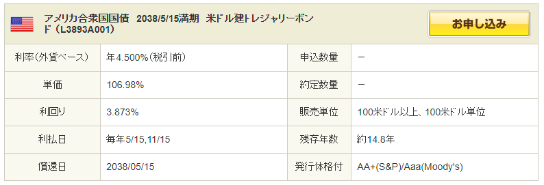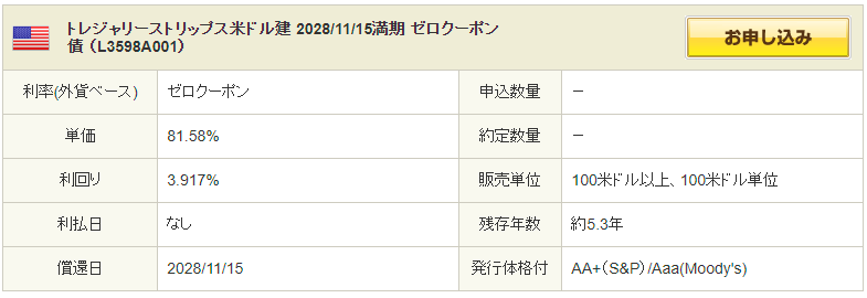 3番目の米ドル債には、「ゼロクーポン」と書かれている。これは、債券をもっている間、利払いが行われないことを意味する。しかし、その分当初の購入額が、この例では81.58%と安く、現在の単価81.58%で償還まで5.3年あれば、利回りは3.917%になるという意味だ。この「ゼロクーポン」債は、期中の利子が払われないので、複利で元本が増えるイメージらしい。
