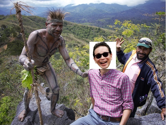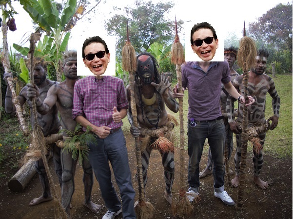 スタートは、ポートモレスビーからゴロカ空港に到着したところからである。ゴロカは東ハイランド州の州都であり、飛行時間は1時間ちょっとだ。パプアニューギニアには4509メートルの万年雪を抱く山ウィルヘルム山があり、ゴロカはその山にも近く、標高1500メートルだ。朝晩は、毛布なしでは寝られない。2011年の人口だが、2万人強と少なく、飛行場には何とターミナルがない!出発地から飛行してきた荷物は、地べたに置かれる。うしろの飛行機は30人乗りくらいだったと思う。(写真は、主だが、タモリさんの顔を使わしていただきました。平にご容赦を! 面倒くさい時代になったものですね。こうして隠しても、テクニックのある人なら、主の顔を暴けるんだろうね)