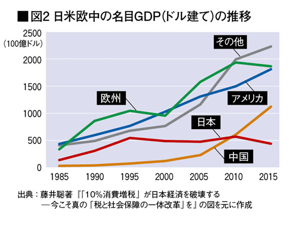 このプラザ合意によって、日本の為替は240円ほどから120円ほどへと倍に円高になった。上の表で、1985年と1995年では倍くらいにGDPがなっているが、これはドル建てで表記されているからだ。単位を「円」で考えるとやはり水平に近い。おまけに2010年からなんと!下降している。