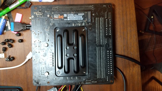 マザーボードの裏に、SSD 250GB M.2 Type2280をいれたところ。スロットを占用しないし、速いのでありがたい。