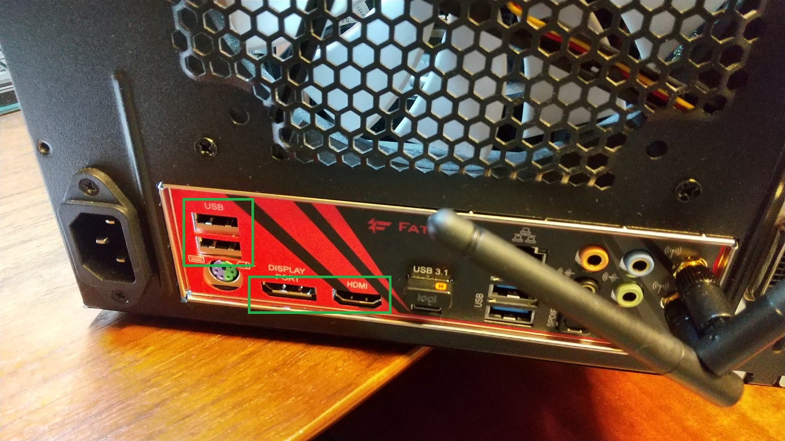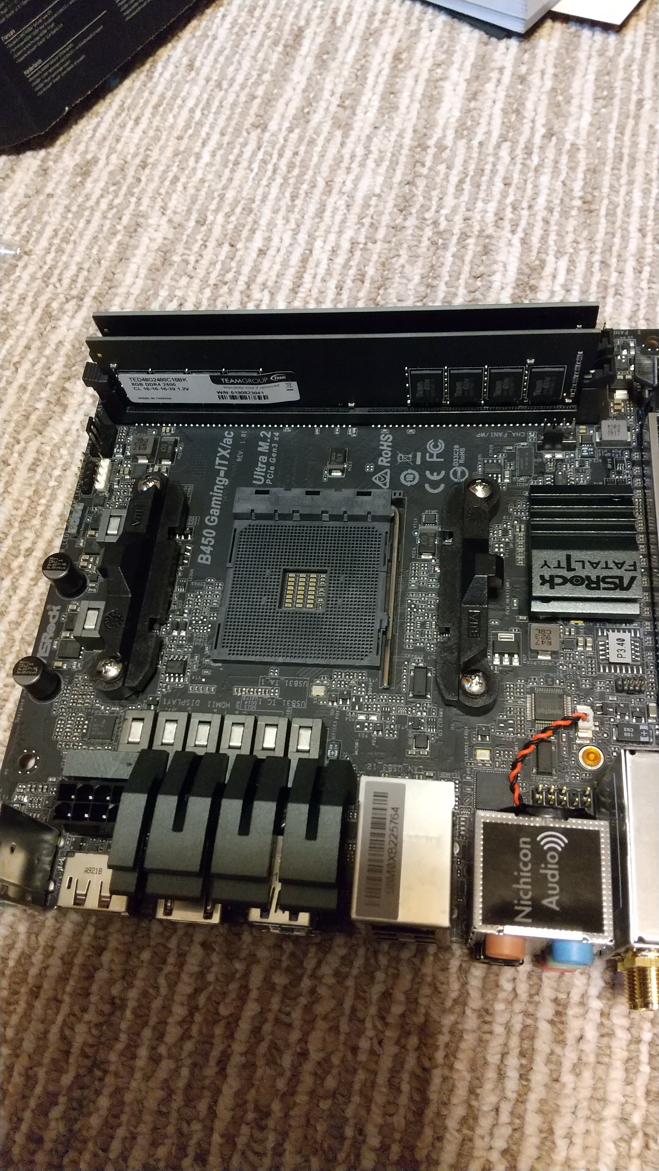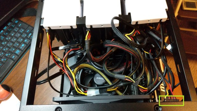 上は、マザーボードの裏のパネルを取り付けたところ。これがうまくいっていなくて、後にもう一度外して入れ直しをしたのだが、その際にトラブルが発生した。あとで気がついたのだが、緑の線で囲ったところが微妙にズレていた (^^);;