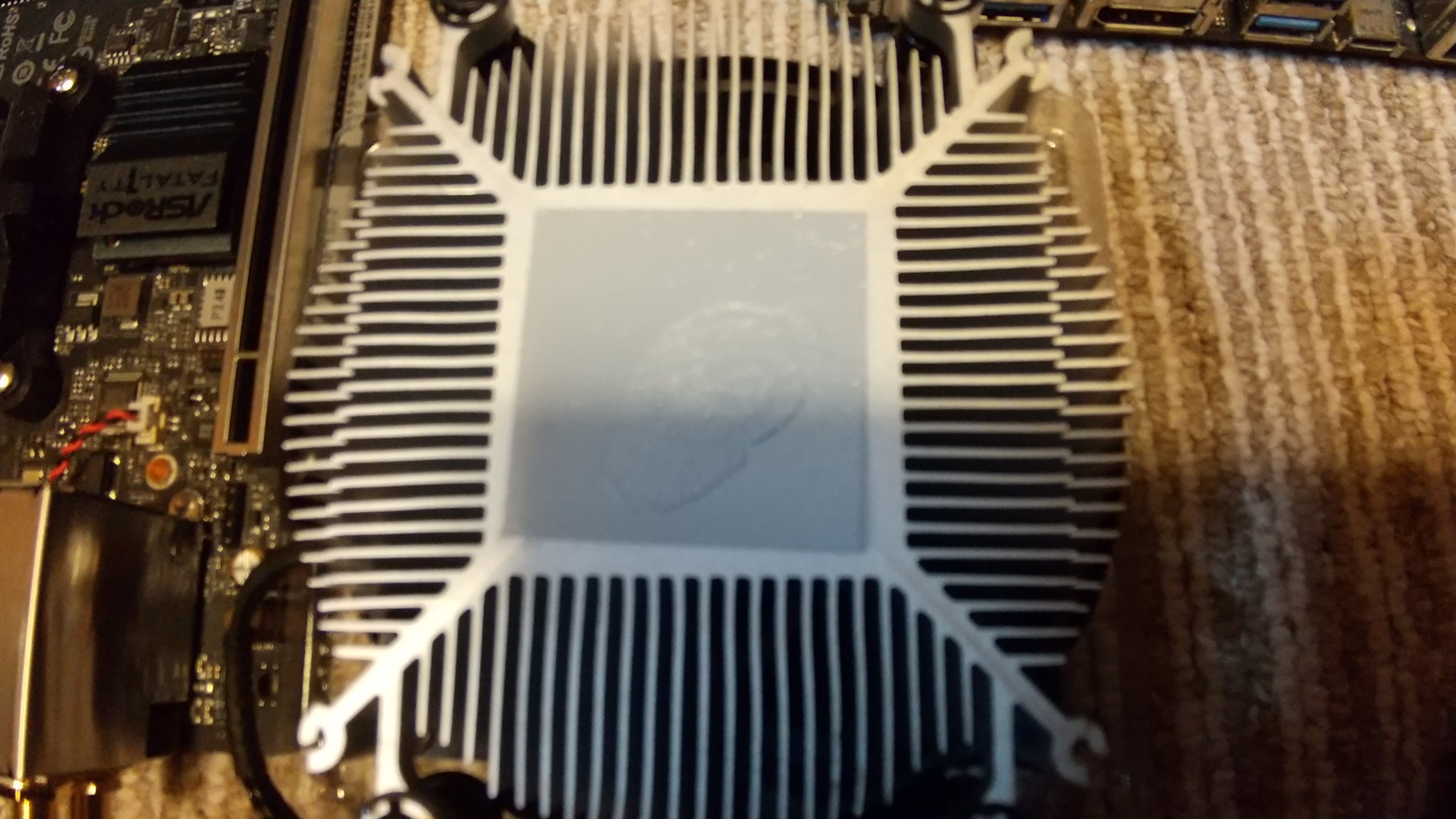 上はCPUクーラー。底に塗ってあるシリコングリースをうっかり触ってしまい、指跡が残ってしまった。皆さんは、触らないように気をつけてください。手元にシリコングリスがあったのだが、横着してこのまま使うことにした。