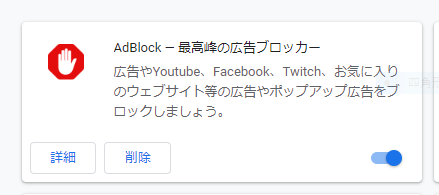 この現象を避けるためには、CHROMEの場合、「設定」、「拡張機能」を開き、AdBlockを不可にします。これでOKです。必要に応じて元に戻してください。