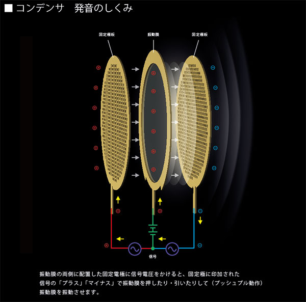 とはいっても、どうも主にはうまく説明できない。コンデンサー型マイクというのがあるらしく、これと逆のことをやっているのだろうか?、それも分からない。(上の図)