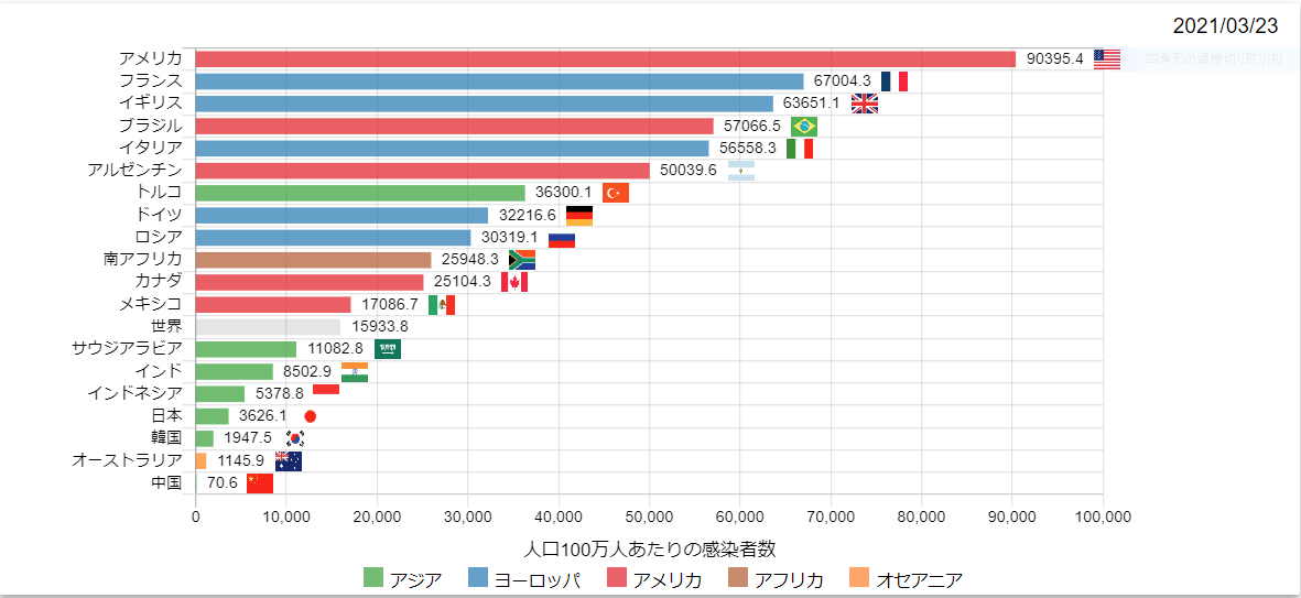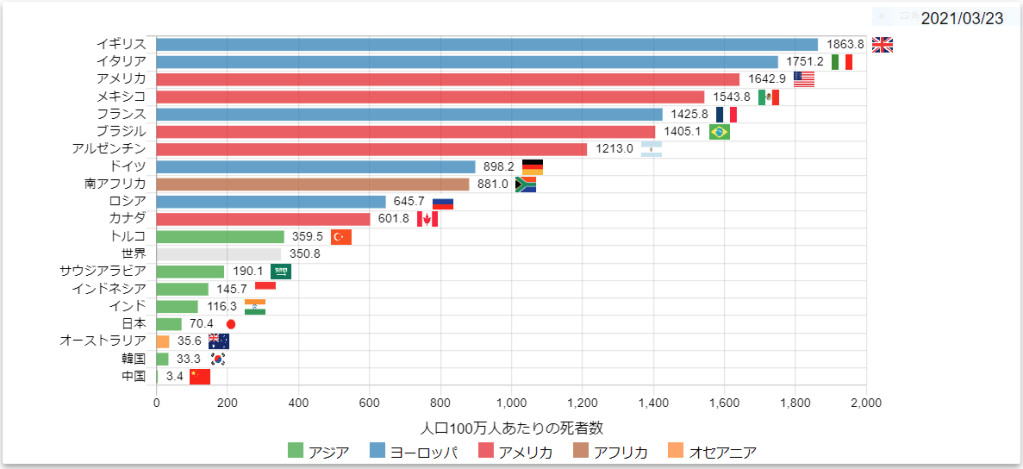 例えば、下の表は、新型コロナの今年3月23日現在の各国の感染者数と死者数である。これを見ると、何よりまず、日本が欧米と比べると何十分の1という、少ない数字でありながら、禄に金銭的な補償もしないまま、欧米と同じような制限を社会に加えているのには驚くが、それはここでは脇におく。